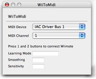 Hold buttons 1 and 2 on the Wii Remote to connect the remote to your Mac. You only have to push these buttons momentarily. After a few moments the WiiToMidi window should say Wii Remote connected.